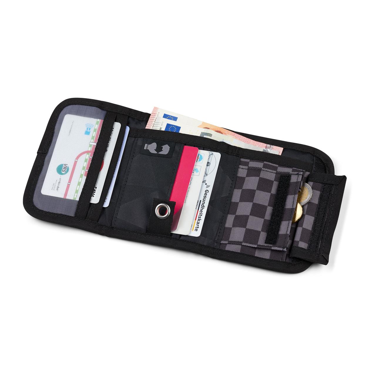 Verschlussart: Klettverschluss drei Kartensteckfächer Geldscheinfach Einsteckfach Einsteckfach mit Sichtfenster Zipperfach mit Sichtfenster Münzfach mit Klettverschluss