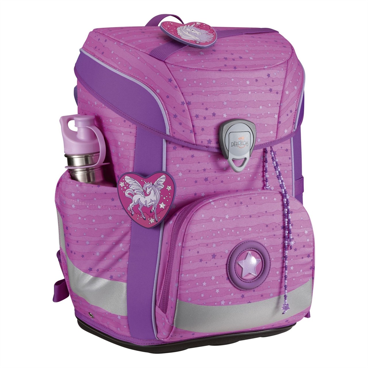 Mit reflektierendem Material an Deckelklappe, Front, Tragegurt und Seitenflächen. Durch das 5tlg. Set ist das Kind perfekt für den Schulalltag ausgestattet. Schultergurte in ergonomischer S-Form und der längen- und höhenverstellbare Brustgurt sind ein weiteres Plus.Mit den Wechselbuttons und Anhängern lässt er sich im Handumdrehen umgestalten